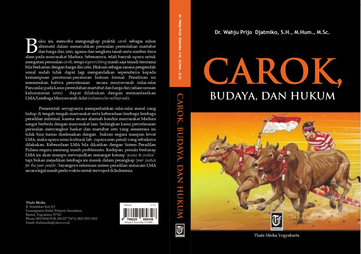 Sebagai ungkapan syukur kepada Tuhan YME  atas  rahmat dan  dan innayah-Nya yang diberikan kepada penulis untuk selalu berikhtiar terus menerus berkarya dalam ranah ilmiah demi menghidupkan  perilaku  akademis.  Budaya  tulis  ini menjadi wahana untuk mencurahkan dan menyumbangkan pemikiran penulis dalam ‘memotret’ lingkungan yakni budaya carok pada sebagian masyarakat Madura yang laten hingga sekarang. Buku dengan judul: “Carok, Budaya dan Hukum” ini disadur dari karya disertasi penulis yang berjudul “Rekonstruksi Budaya Hukum dalam Menanggulangi Carok di Masyarakat Madura Berdasar Nilai-Nilai Pancasila Sebagai Sarana Politik Kriminal” yang dipertahankan pada Program Doktor Ilmu Hukum, Fakultas Hukum, Univesitas Diponegoro pada Februari 2019.